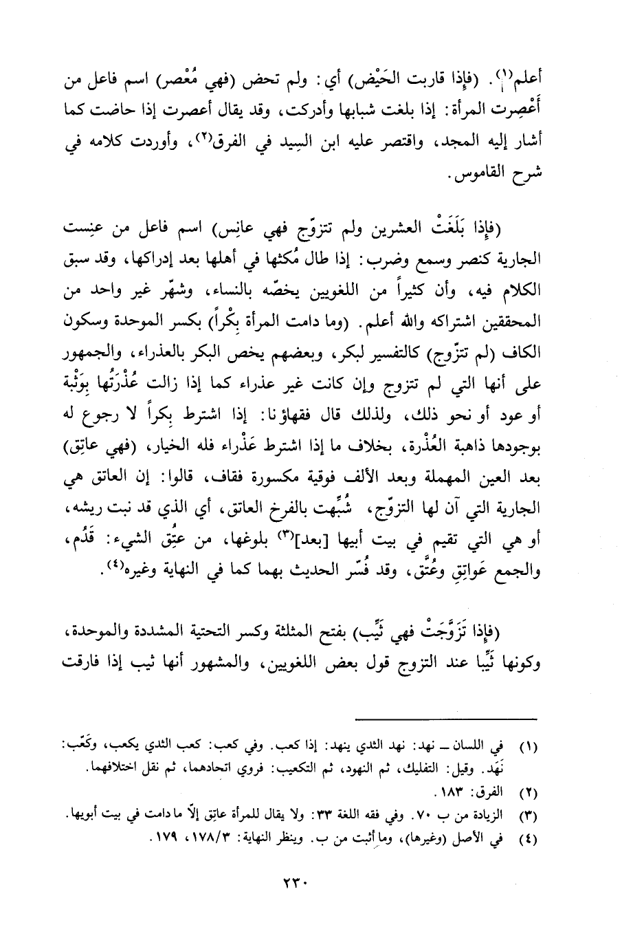 (فإذا بلغت العشرين ولم تتزوج فهي عانس) اسم فاعل من عنست الجارية كنصر وسمع وضرب: إذا طال مكثلها في أهلها بعد إدراكها, وقد سبق الكلام فيه, وأن كثيرًا من اللغويين يخصه بالنساء, وشهر غير واحد من المحققين اشتراكه والله أعلم. (وما دامت المرأة بكرًا) بكسر الموحدة وسكون الكاف (لم تتزوج) كالتفسير لبكر, وبعضهم يخص البكر بالعذراء, والجمهور على أنها التي لم تتزوج وإن كانت غير عذراء كما إذا زالت عذرتها بوثبة أو عود أو نحو ذلك, ولذلك قال فقهاؤنا: إذا اشترط بكرًا لا رجوع له بوجوها ذاهبة العذرة, بخلاف ما إذا اشترط عذراء فله الخيار, (فهي عاتق) بعد العين المهملة وبعد الألف فوقية مكسورة فقاف, قالوا: إن العاتق هي الجارية التي آن لها التزوج, شبهت بالفرخ العاتق, أي الذي قد نبت ريشه, أو هي التي تقيم في بيت أبيها [بعد] بلوغها, من عتق الشيء: قدم, والجمع عواتق وعتق, وقد فسر الحديث بهما كما في النهاية وغيره.