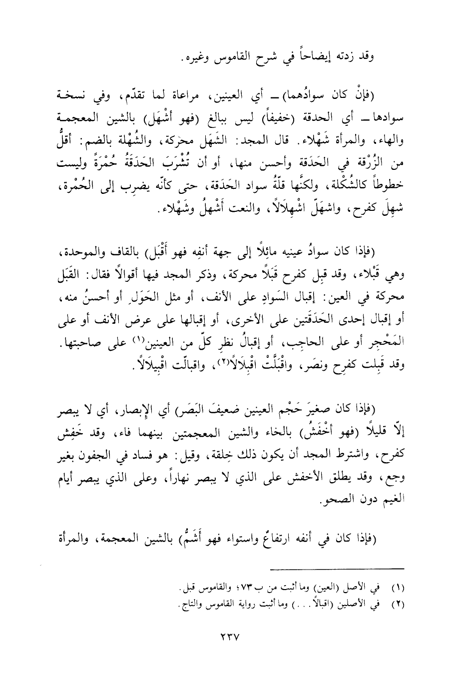 (فإذا كان سواد عينيه مائلًا إلى جهة أنفه فهو أقبل) بالقاف والموحدة, وهي قبلاء, وقد قبل كفرح قبلًا محركة, وذكر المجد فيها أقوالًا فقال: القبل محركة في العين: إقبال السواد على الأنف, أو مثل الحول أو أحسن منه, أو إقبال إحدى الحدقتين على الأخرى, أو إقبالهما على عرض الأنف أو على المحجر أو على الحاجب, أو إقبال نظر كل من العينين على صاحبتها. وقد قبلت كفرح ونصر, واقبلت واقبلالًا, واقبالت اقبيلالًا.