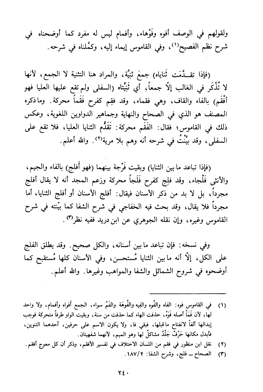 (فإذا تباعد ما بين الثنايا) وبقيت فرجة بينهما (فهو أفلج) بالفاء والجيم, والأنثى فلجاء, وقد فلج كفرح فلجًا محركة وزعم المجد أنه لا يقال أفلج مجردًا, بل لابد من ذكر الأسنان فيقال: أفلج الأسنان أو أفلج الثنايا, أما مجردًا فلا يقال, وقد بحث فيه الخفاجي في شرح الشفا كما بينته في شرح القاموس وغيره, وإن نقله الجوهري عن ابن دريد ففيه نظر.