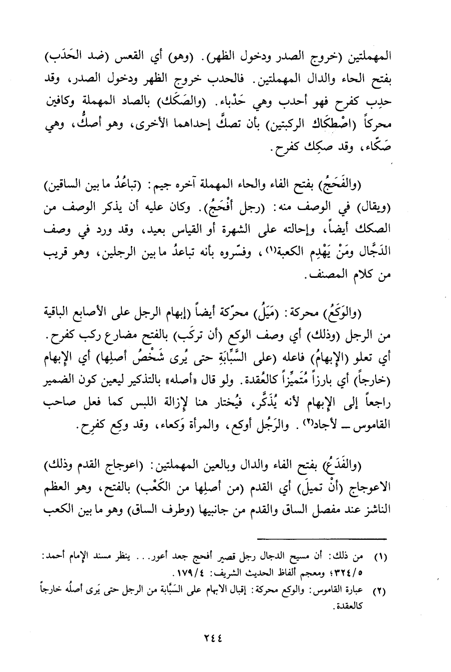 (والفدع) بفتح الفاء والدال وبالعين المهملتين: (اعوجاج القدم وذلك) الاعوجاج (أن تميل) أي القدم (من أصلها من الكعب) بالفتح, وهو العظم الناشز عند مفصل الساق والقدم من جانبيها (وطرف الساق) وهو ما مبين الكعب