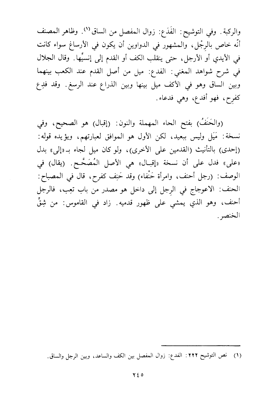(والحنف) بفتح الحاء المهملة والنون: (إقبال) هو الصحيح, وفي نسخة: ميل وليس ببعيد, لكن الأول هو الموافق لعبارتهم, ويؤيده قوله: (إحدى) بالتأنيث (القدمين على الأخرى) , ولو كان ميل لجاء بـ «إلى» بدل «على» فدل على أن نسخة «إقبال» هي الأصل المصحح. (يقال) في الوصف: (رجل أحنف, وامرأة حنفاء) وقد حنف كفرح, قال في المصباح: الحنف: الاعوجاج في الرجل إلى داخل هو مصدر من باب تعب, فالرجل أحنف, وهو الذي يمشي على ظهور قدميه. زاد في القاموس: من شق الخنصر.