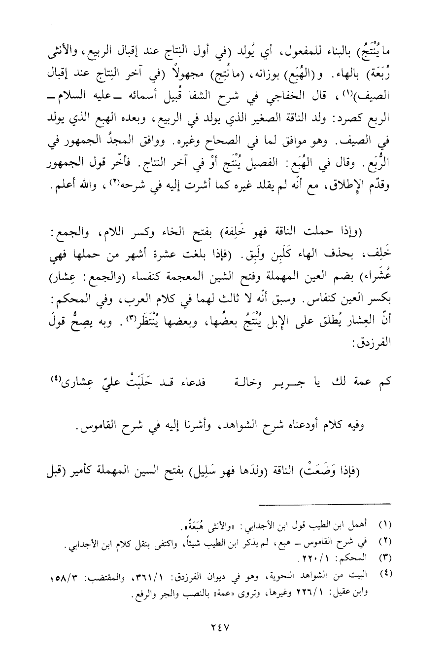 ما ينتج) بالبناء للمفعول, أي يولد (في أول النتاج عند إقبال الربيع, والأنثى ربعة) بالهاء. و (الهبع) بوزانه, (ما نتج) مجهولًا (في آخر النتاج عند إقبال الصيف) , قال الخافجي في شرح الشفا قبيل أسمائه - علليه السلام - الربع كصرد: ولد الناقة الصغير الذي يولد في الربيع, وبعده الهبع الذي يولد في الصيف. وهو موافق لما في الصحاح وغيره. ووافق المجد الجمهور في الربع. وقال في الهبع: الفصيل ينتج أو في آخر النتاج. فأخر قول الجمهور وقدم الإطلاق, مع أنه لم يقلد غيره كما أشرت إليه في شرحه, والله أعلم.