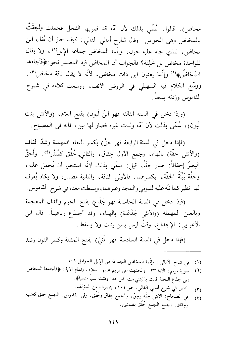 مخاض). قالوا: سمي بذلك لأن أمه قد ضربها الفحل فحملت ولحقت بالمخاض وهي الحوامل. وقال شارح أمالي القالي: كيف جاز أن يقال ابن محاض, للذي جاء عليه حول, وإنما المخاض جماعة الإبل, ولا يقال للواحدة مخاض بل خلقة؟ فالجواب أن المخاض فيه المصدر نحو: {فأجاءها المخاض} وإنما يعنون ابن ذات مخاض, لأنه لا يقال ناقة مخاض. ووسع الكلام فيه السهيلي في الروض الأنف, ووسعت كلامه في شرح القاموس وزدته بسطًا.