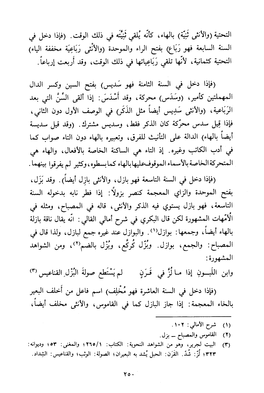 (فإذا دخل في السنة التاسعة فهو بازل, والأنثى بازل أيضًا). وقد بزل, بفتح الموحدة والزاي المعجمة كنصر بزولًا: إذا فطر نابه بدخوله السنة التاسعة, فهو بازل يستوي فيه الذكر والأنثى, قاله في المصباح, ومثله في الأمهات المشهورة لكن قال البكري في شرح أمالي القالي: أنه يقال ناقة بازلة بالهاء أيضًا, وجمعها: بوازل. والبوازل عند غيره جمع لبازل, ولذا قال في المصباح: والجمع, بوازل. وبزل كركع, وبزل بالضم, ومن الشواهد المشهورة: