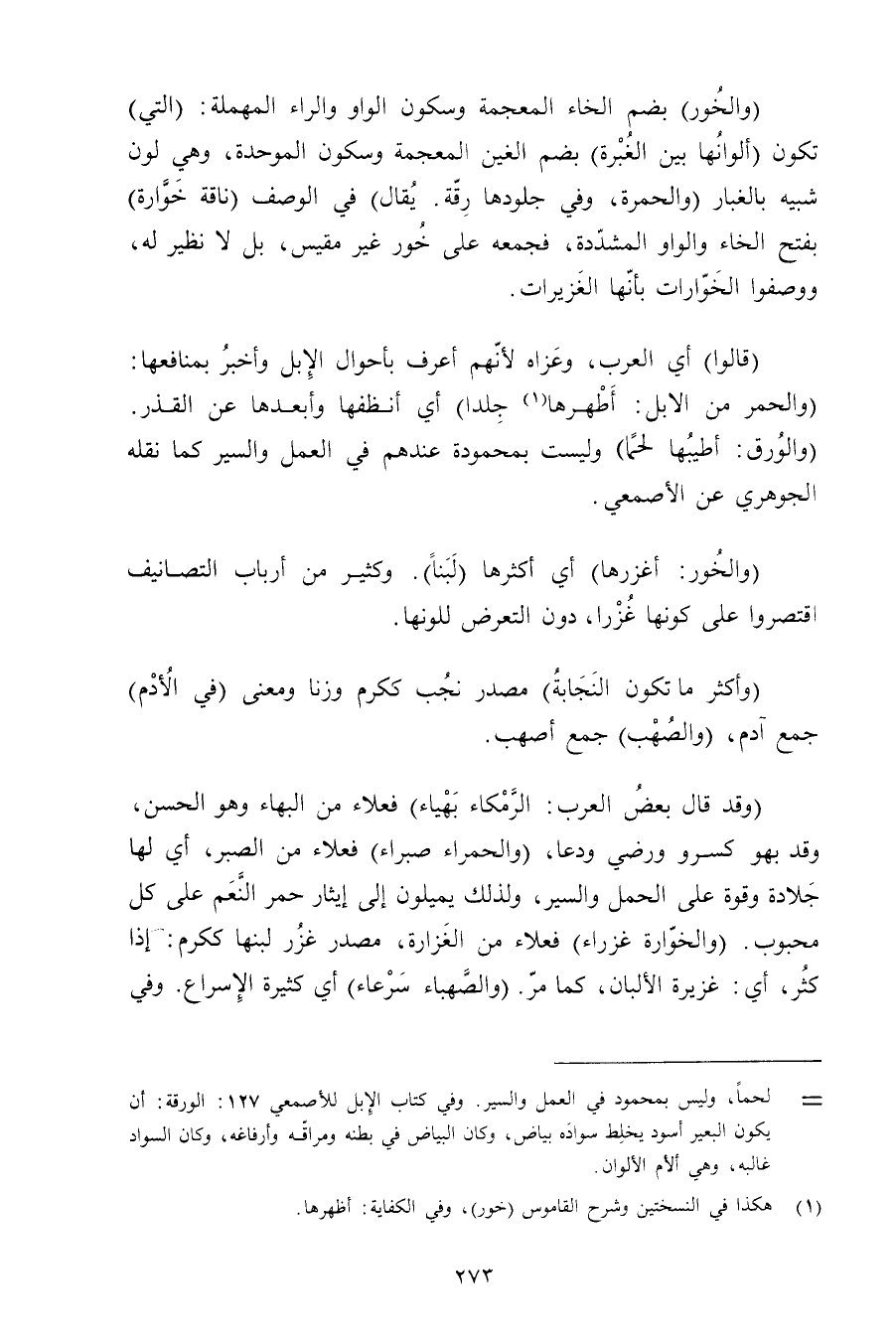 (والخور: أغزرها) أي أكثرها (لبنًا). وكثير من أرباب التصانيف اقتصروا على كونها غزرا, دون التعرض للونها.