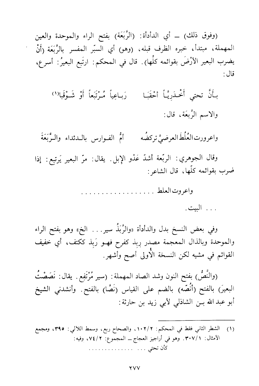 وفي بعض النساخ بدل والدأدأة «والربذ سير ... الخ» وهو بفتح الراء والموحدة وبالذال المعجمة مصدر ربذ كفرح فهو ربذ ككتف, أي خفيف القوائم في مشيه لكن النسخة الأولى أصح وأشهر.