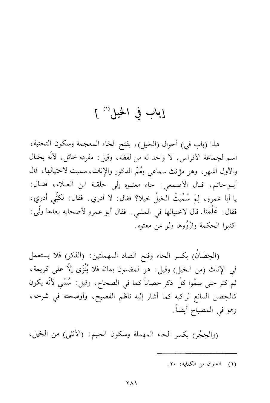 هذا (باب في) أحوال (الخيل) , بفتح الخاء المعجمة وسكون التحتية, اسم لجماعة الأفراس, لا واحد له من لفظه, وقيل: مفرده خائل, لأنه يختال والأول أِهر, وهو مؤنث سماعي يعم الذكور والإناث, سميت لاختيالها, قال أبو حاتم, قال الأصمعي: جاء معتوه إلى حلقة ابن العلاء, فقال: يا أبا عمرو, لم سميت الخيل خيلا؟ فقال: لا أدري. فبقال: لكني أدري, فقال: علمنا. قال لاختيالها في المشي. فقال أبو عمرو لأصحابه بعدما ولي: اكتبواة الحكمة وارووها ولو عن معتوه.