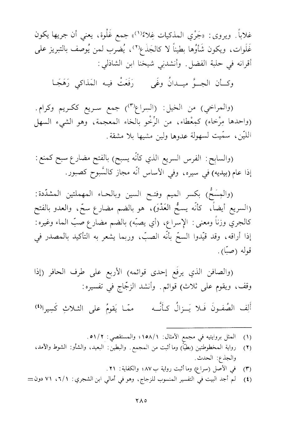 (والمسح) بكسر الميم وفتح السين وبالحاء المهلمتين المشددة: (السريع أيضًا, كأنه يسح العدو) , هو بالضم مضارع سح, والعدو بالفتح كالجري وزنًا ومعنى: الإسراع, (أي يصبه) بالضم مضارع صب الماء وغيره: إذا أراقه, وقد قيدا السح بأنه الصب, وربما يشعر به التأكيد بالمصدر في قوله (صبًا).