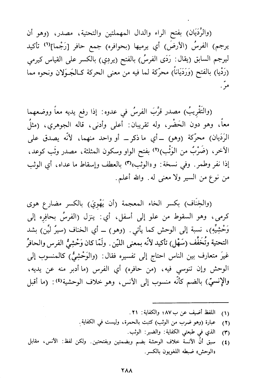 (والخناف) بكسر الخاء المعجمة (أن يهوي) بالكسر مضارع هوى كرمى, وهو السقوط من علو إلى أسفل, أي: ينزل (الفرس بحافره إلى وحشيه) , نسبة إلى الوحش كما يأتي. (وهو) - أي الخناف (سير لين) بشد التحتية وتخفف (سهل) تأكيد لأنه بمعنى اللين. ولما كان وحشي الفرس والحافر غير متعارف بين الناس احتاج إلى تفسيره فقال: (والوحشي) كالمنسوب إلى الوحش وإن تنوسي فيه, (من حافره) أي الفرس (ما أدبر منه عن يديه, والإنسي) بالضم كأنه منسوب إلى الأنس, وهو خلاف الوحشية: (ما أقبل