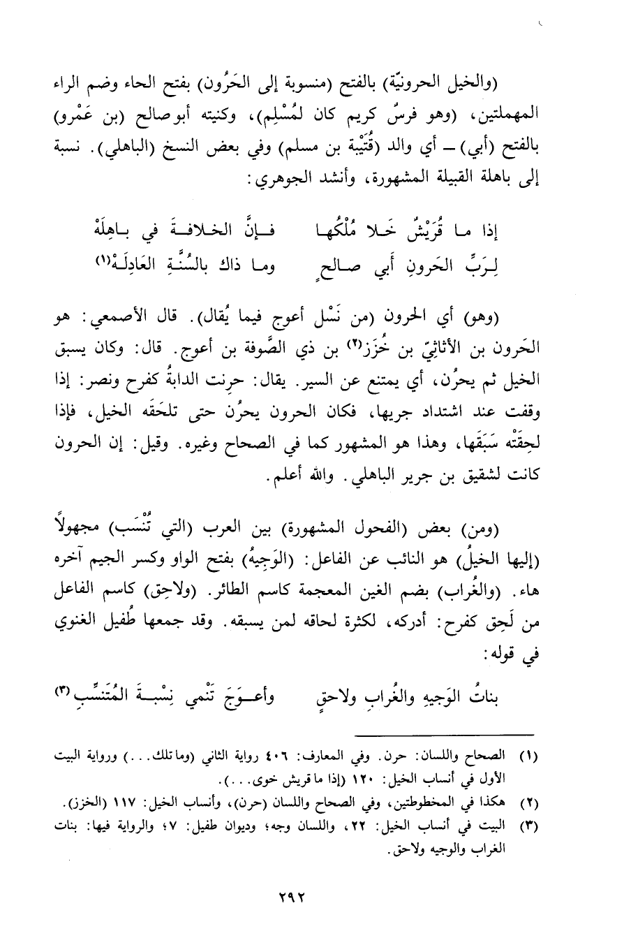 (والخيل الحرونية) بالفتح (منسوبة إلى الحرون) بفتح الحاء وضم الراء المهملتين, (وهو فرس كريم كان لمسلم) , وكنيته أبو صالح (بن عمرو) بالفتح (أبي) - أي والد (قتيبة بن مسلم) وفي بعض النسخ (الباهلي). نسبة إلى باهلة القبيلة المشهورة, وأنشد الجوهري: