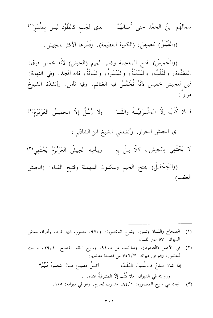 (والخميس) بفتح المعجمة وكسر الميم (الجيش) لأنه خمس فرق: المقدمة, والقلب, والميمنة, والميسرة, والساقة, قاله المجد. وفي النهاية: قيل للجيش خميس لأنه تخمس فيه الغنائم, وفيه تأمل. وأنشدنا الشيوخ مرارًا: