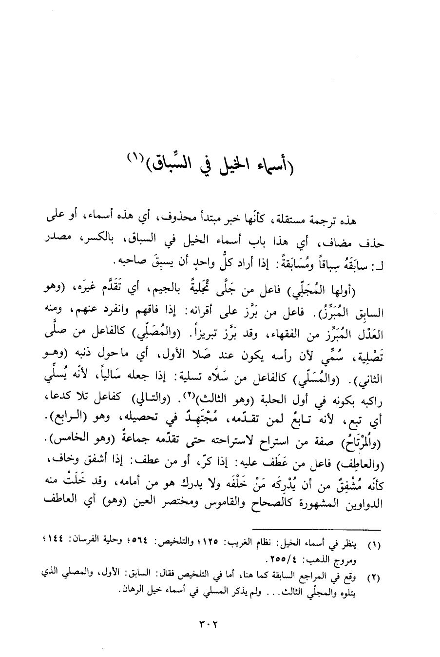 (أولها المجلي) فاعل من جلى تجليةً بالجيم, أي تقدم غيره, (وهو السابق المبرز). فاعل من برز على أقرانه: إذا فاقهم وانفرد عنهم, ومنه العدل المبرز من الفقهاء, وقد برز تبريزًا. (والمصلي) كالفاعل من صلى تصلية, سمي لأن رأسه يكون عند صلا الأول, أي ما حول ذنبه (وهو الثاني). (والمسلي) كالفاعل من سلاة تسلية: إذا جعله ساليًا, لأنه يسلي راكبه بكونه في أول الحلبة (وهو الثالث). (والتالي) كفاعل تلا كدعا, أي تبع, لأنه تابع لمن تقدمه, مجتهد في تحصيله, وهو (الرابع). (والمرتاج) صفة من استراح لاستراحته حتى تقدمه جماعة (وهو الخامس). (والعاطف) فاعل من عطف عليه: إذا كر, أو من عطف: إذا أشفق وخاف, كأنه مشفق من أن يدركه من خلفه ولا يدرك هو من أمامه, وقد خلت منه الدواوين المشهورة كالصحاح والقاموس ومختصر العين (وهو) أ] العاطف