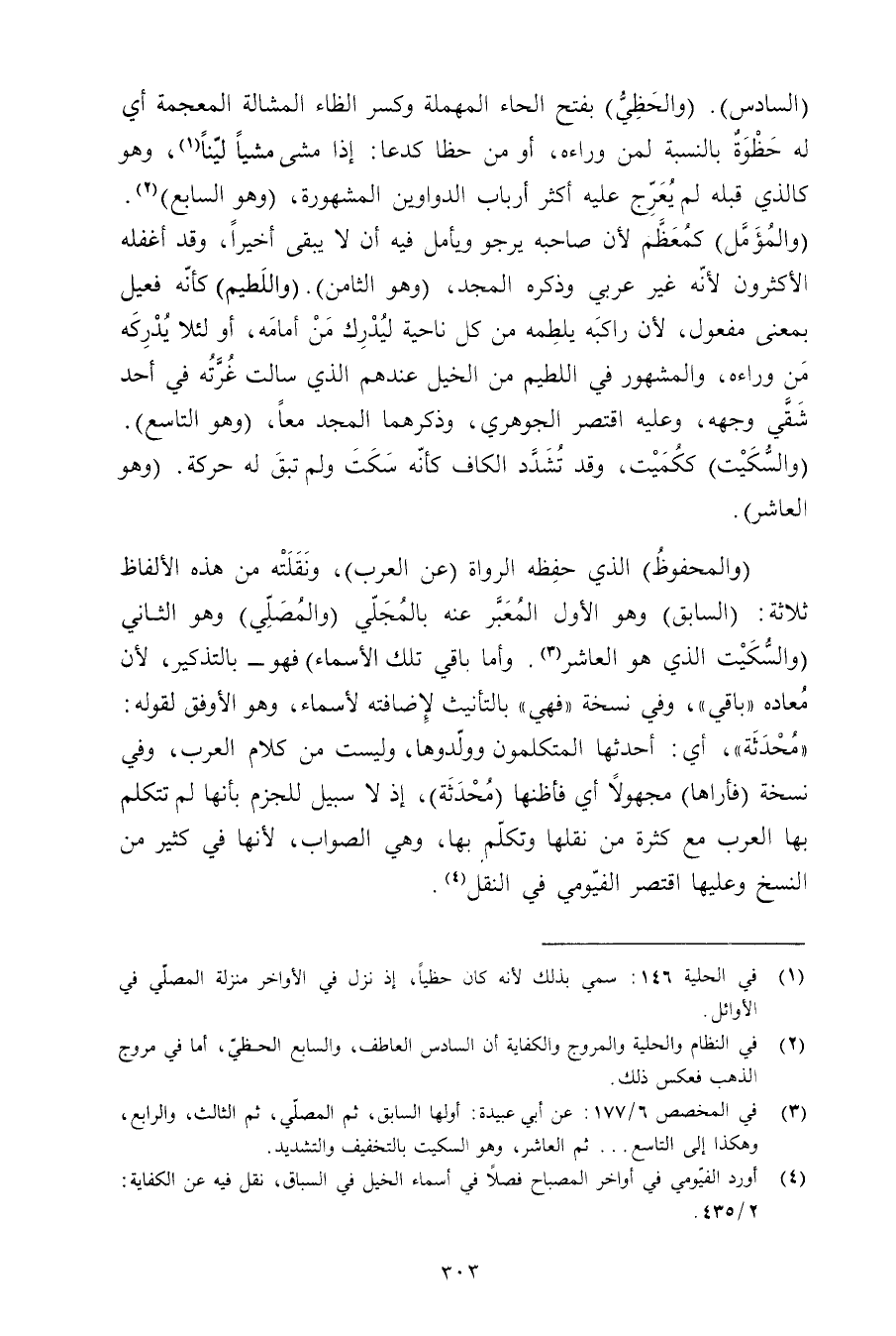 (السادس). (والخطي) بفتح الحاء المهملة وكسر الظاء المشالة المعجمة أي له خظوة بالنسبة لمن وراءه, أو من حظا كدعا: إذا مشى مشيًا لينًا, وهو كالذي قبله لم يعرج عليه أكثر أرباب الدواوين المشهورة, (وهو السابع). (والمؤمل) كمعظم لأن صاحبه يرجو ويأمل فيه أن لا يبقى أخيرًا, وقد أغفله الأكثرون لأنه غير عربي وذكره المجد, (وهو الثامن). (واللطيم) كأنه فعيل بمعنى مفعول, لأن راكبه يلطمه من كل ناحية ليدرك من أمامه, أو لئلا يدركه من وراءه, والمشهور في اللطيم من الخيل عندهم الذي سالت غرته في أحد شقي وجهه, وعليه اقتصر الجوهري, وذكرهما المجد معًا, (وهو التاسع).