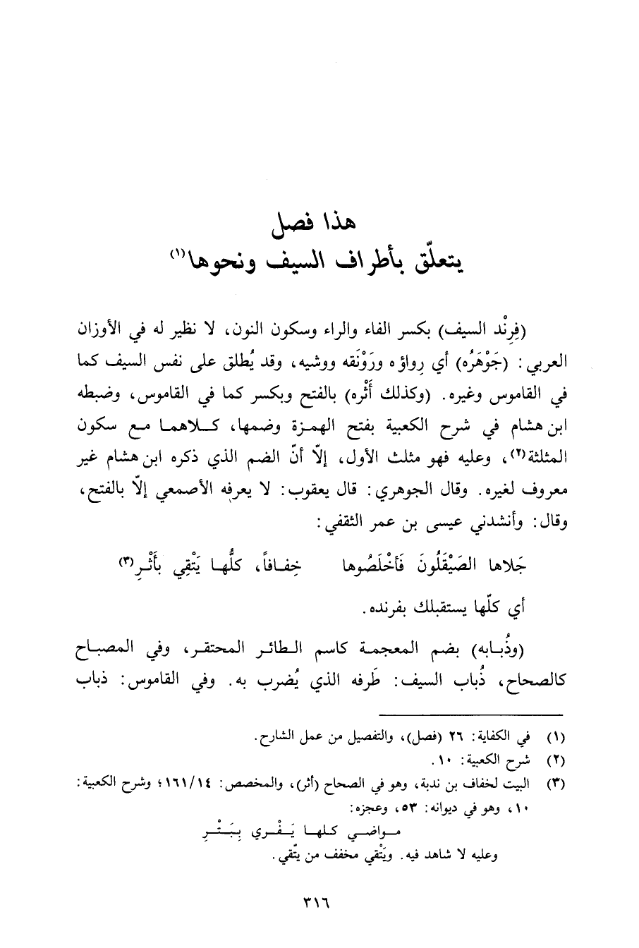 (فرند السيف) بكسر الفاء والراء وسكون النون, لا نظير له في الأوزان العربي: (جوهره) أي رواؤه ورونقه ووشيه, وقد يطلق على نفس السيف كما في القاموس وغيره. (وكذلك أثره) بالفتح وبكسر كما في القاموس, وضبطه ابن هشام في شرح الكعبية بفتح الهمزة وضمها, كلاهما مع سكون المثلثة, وعليه فهو مثلث الأول, إلا أن الضم الذي ذكره ابن هشام غير معروف لغيره. وقال الجوهري: قال يعقوب: لا يعرفه الأصمعي إلا بالفتح, وقال: وأنشدني عيسى بن عمر الثقفي: