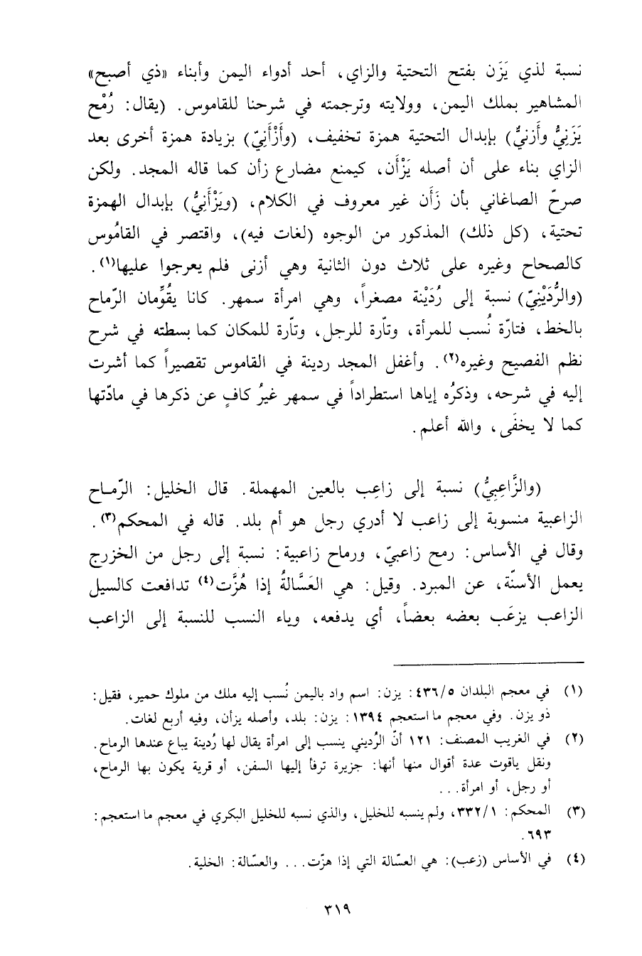 نسبة لذي يزن بفتح التحتية والزاي, أحد أدواء اليمن وأبناء «ذي أصبح» المشاهير بملك اليمن, وولايته وترجمته في شرحنا للقاموس. (ويقال: رمح يزني وأزني) بإبدال التحتية همزة تخفيف, (وأزأني) بزيادة همزة أخرى بعد الزاي بناء على أن أصله يزأن, كيمنع مضارع زأن كما قاله المجد. ولكن صرح الصاغاني بأن زأن غير معروف في الكلام, (ويزأني) بإبدل الهمزة تحتية, (كل ذلك) المذكور من الوجوه (لغات فيه) , واقتصر في القاموس كالصحاح وغيره على ثلاث دون الثانية وهي أزنى فلم يعرجوا عليها.