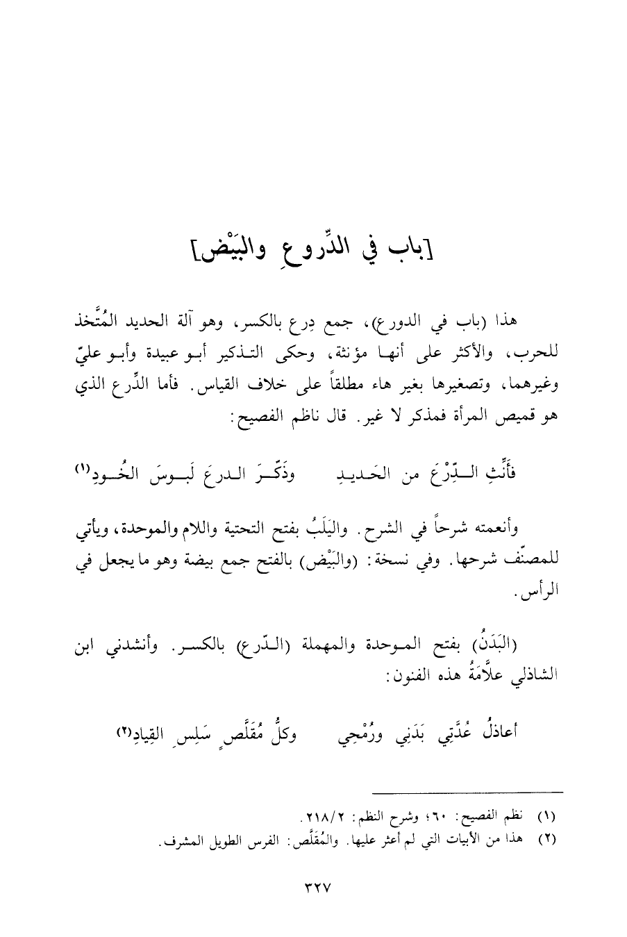 هذا (باب في الدروع) , جمع درع بالكسر, وهو آلة الحديد المتخذ للحرب, والأكثر على أنها مؤنثة, وحكى التذكير أبو عبيدة وأبو عليّ وغيرهما, وتصغيرهما بغير هاء مطلقًا على خلاف القياس. فأما الدرع الذي هو قميص المرأة فمذكر لا غير. قال ناظم الفصيح:
