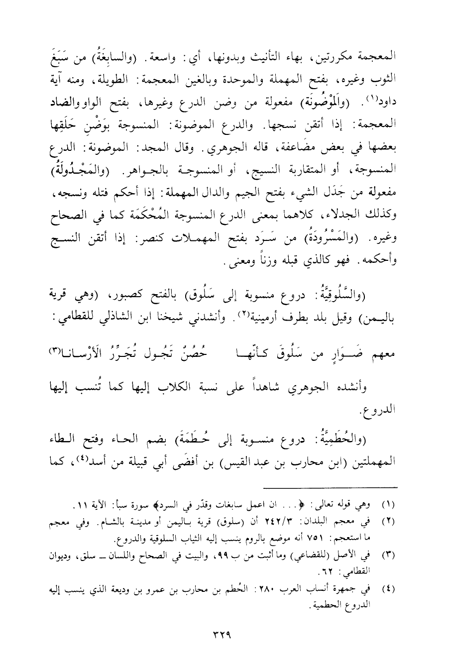 المعجمة مكررتين, بهاء التأنيث وبدونها, أي: واسعة. (والسابغة) من سبغ الثوب وغيره, بفتح المهملة والموحدة وبالغين المعجمة: الطويلة, ومنه آية داود. (والموضونة) مفعولة من وضن الدرع وغيرها, بفتح الواو والضد المعجمة: إذا أتقن نسجها. والدرع الموضونة: المنسوجة بوضن حلقها بعضها في بعض مضاعفة, قاله الجوهري. وقال المجد: الموضونة: الدرع المنسوجة, أو المتقاربة النسيج, أو المنسوجة بالجواهر. (والمجدولة) مفعولة من جدل الشيء بفتح الجيم والدال المهملة: إذا أحكم فتله ونسجه, وكذلك الجدلاء, كلاهما بمعنى الدرع المنسوجة المحكمة كما في الصحاح وغيره. (والمسرودة) من سرد بفتح المهملات كنصر: إذا أتقن النسج وأحكمه. فهو كالذي قبله وزنًا ومعنى.