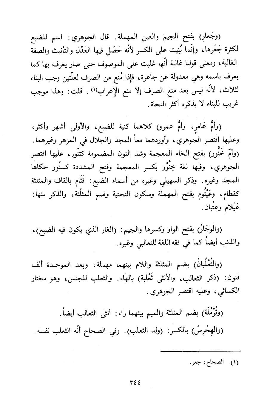 (وجعار) بفتح الجيم والعين المهملة. قال الجوهري: اسم للضبع لكثرة جعرها, وإنما بنيت على الكسر لأنه حصل فيها العدل والتأنيث والصفة الغالبة, ومعنى قولنا غالبة أنها غلبت على الموصوف حتى صار يعرف بها كما يعرف باسمه وهي معدولة عن جاعرة, فإذا منع من الصرف لعلتين وجب البناء لثلاث, لأنه ليس بعد منع الصرف إلا منع الإعراب. قلت: وهذا موجب غريب للبناء لا يذكره أكثر النحاة.