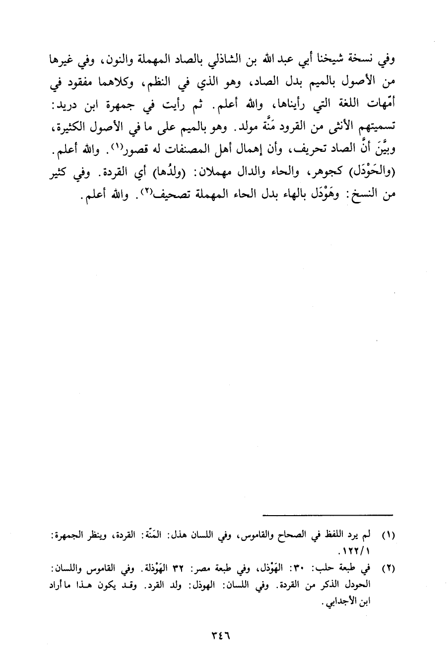 وفي نسخة شيخنا أبي عبد الله بن الشاذلي بالصاد المهملة والنون, وفي غيرها من الأصول بالميم بدل الصاد, وهو الذي في النظم, وكلاهما مفقود في أمهات اللغة التي رأيناها, والله أعلم. ثم رأيت في جمهرة ابن دريد: تسميتهم الأنثى من القرود منه مولد. وهو بالميم على ما في الأصول الكثيرة, وبين أن الصاد تحريف, وأن إهمال أهل المصنفات له قصور. والله أعلم. (والحودل) كجوهر, والحاء والدال مهملان: (ولدها) أي القردة. وفي كثير من النسخ: وهودل بالهاء بدل الحاء المهملة تصحيف. والله أعلم.