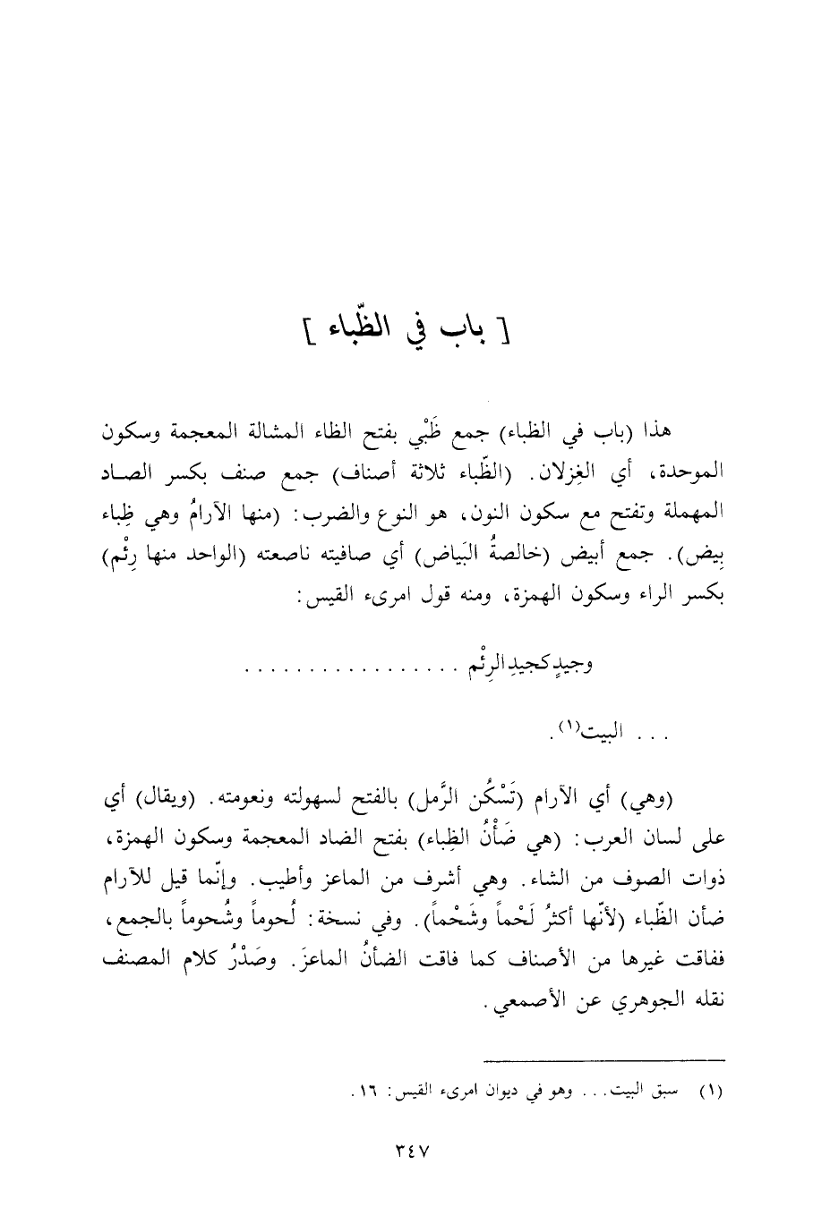 هذا (باب في الظباء) جمع ظبي بفتح الظاء المشالة المعجمة وسكون الموحدة, أي الغزلان. (الظباء ثلاثة أصناف) جمع صنف بكسر الصاد المهملة وتفتح مع سكون النون, هو النوع والضرب: (منها الآرام وهي ظباء بيض). جمع أبيض (خالصة البياض) أي صافيته ناصعته (الواحد منها رئم) بكسر الراء وسكون الهمزة, ومنه قول امرئ القيس: