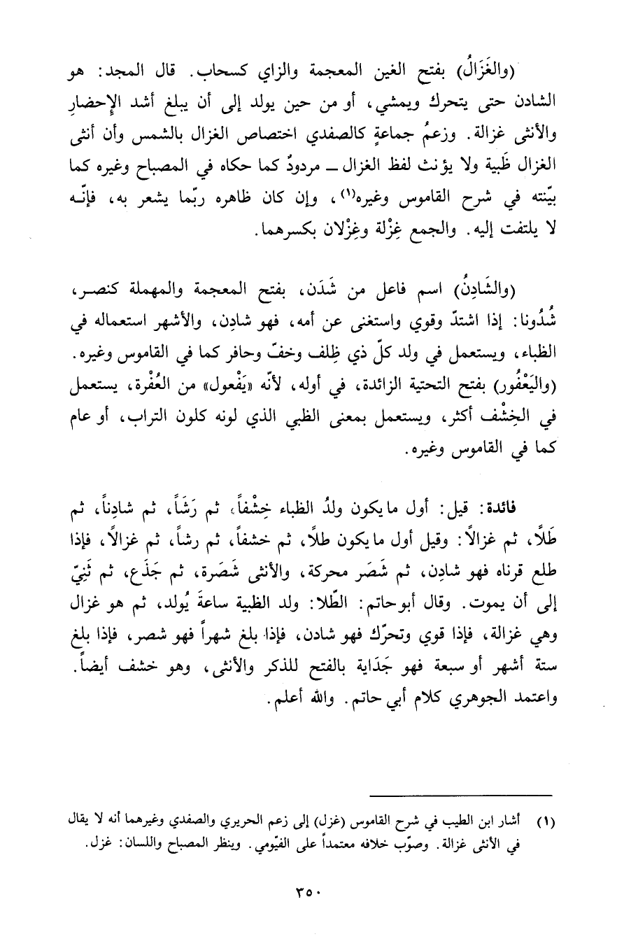 (والغزال) بفتح الغين المعجمة والزاي كسحاب. قال المجد: هو الشادان حتى يتحرك ويمشي, أو من حين يولد إلى أن يبلغ أشد الإحضار والأنثى غزالة. وزعم جماعةٍ كالصفدي اختصاص الغزال بالشمس وأن أنثى الغزال ظبية ولا يؤنث لفظ الغزال - مردود كما حكاه في المصباح وغيره كما بينته في شرح القاموس وغيره, وإن كان ظاهره ربما يشعر به, فإنه لا يلتفت إليه. والجمع غزلة وغزلان بكرسهما.