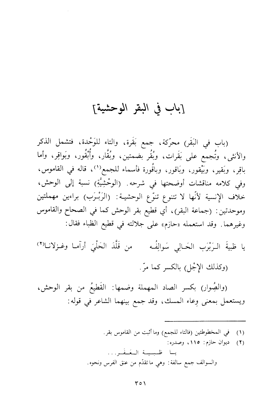 (باب في البقر) محركة, جمع بقرة, والتاء للوحدة, فتشمل الذكر والأنثى, وتجمع على بقرات, وبقر بضمتين, وبقار, وأبقور, وبواقر, وأما باقر, وبقير, وبيقور, وباقور, وباقورة فأسماء للجمع, قاله في القاموس, وفي كلامه مناقشات أوضحتها في شرحه. (الوحشية) نسبة إلى الوحش, خلاف الإنسية لأنها لا تتنوع تنوع الوحشية: (الربرب) براءين مهملتين وموحدتين: (جماعة البقر) , أي قطيع بقر الوحش كما في الصحاح والقاموس وغيرهما. وقد استعمله «حازم» على جلالته في قطيع الظباء فقال: