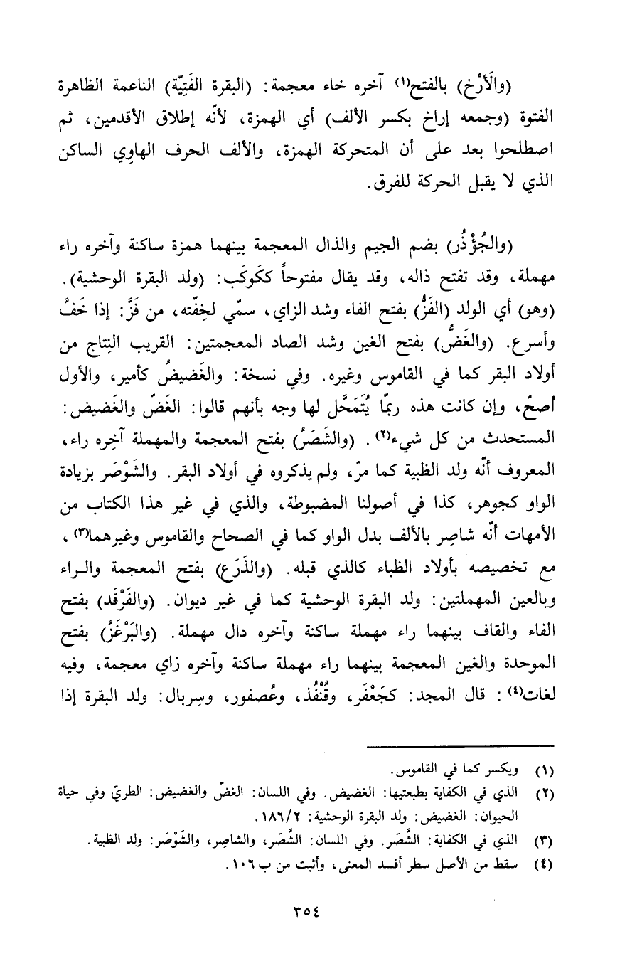 (والجؤذر) بضم الجيم والذال المعجمة بينهما همزة ساكنة وآخره راء مهملة, وقد تفتح ذاله, وقد يقال مفتوحًا ككوكب: (ولد البقرة الوحشية). (هو) أي الولد (الفز) بفتح الفاء وشد الزاي, سمي لخفته, من فز: إذا خف وأسرع. (والغض) بفتح الغين وشد الصاد المعجمتين: القريب النتاج من أولاد البقر كما في القاموس وغيره. وفي نسخة: والغضيض كأمير, والأول أصح, وإن كانت هذه ربما يتمحل لها وجه بأنهم قالوا: الغض والغضيض: المستحدث من كل شيء. (والشصر) بفتح المعجمة والمهملة آخره راء, المعروف أنه ولد الظبية كما مر, ولم يذكروه في أولاد البقر. والشوصر بزيادة الواو كجوهر, كذا في أصولنا المضبوطة, والذي في غير هذا الكتاب من الأمهات أنه شاصر بالألف بدل الواو كما في الصحاح والقاموس وغيرهما, مع تخصيصة بأولاد الظباء كالذي قبله. (والذرع) بفتح المعجمة والراء وبالعين المهملتين: ولد البقرة الوحشية كما في غير ديوان. (والفرقد) بفتح الفاء والقاف بينهما راء مهملة ساكنة وآخره دال مهملة. (والبرغز) بفتح الموحدة والغين المعجمة بينهما راء مهملة ساكنة وآخره زاي معجمة, وفيه لغات: قال المجد: كجعفر, وقنفذ, وعصفور, وسربال: ولد البقرة إذا
