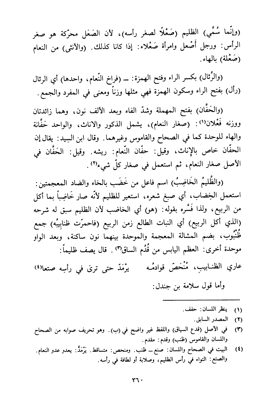 (والظليم الخاضب) اسم فاعل من خضب بالخاء والضاد المعجمتين: استعمل الخضاب, أي صبغ شعره, استعير للظليم لأنه صار خاضبًا بما أكل من الربيع, ولذا فسره بقوله: (هو) أي الخاضب لأن الظليم سبق له شرحه (الذي أكل الربيع) أي البنات الطالع زمن الربيع (فاحمرت ظنابيبه) جمع ظنبوب, بضم المشالة المعجمة والموحدة بينهما نون ساكنة, وبعد الواو موحدة أخرى: العظم اليابس من قدم الساق. قال يصف ظليمًا: