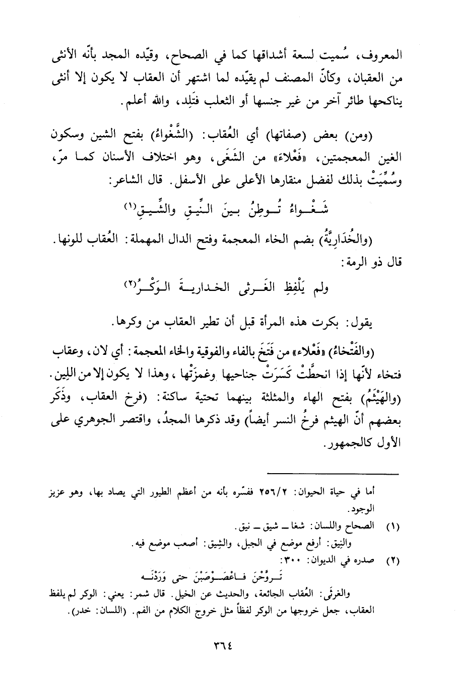 (ومن) بعض (صفاتها) أي العقاب: (الشغواء) بفتح الشين وسكون الغين المعجميتن, «فعلا» من الشغى, وهو اختلاف الأسنان كما مر, وسميت بذلك لفضل منقارها الأعلى على الأسفل. قال الشاعر: