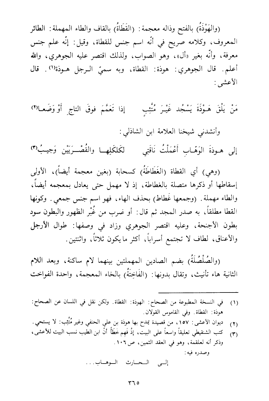 (والصلصلة) بضم الصادين المهملتين بينهما لام ساكنة, وبعد اللام الثانة هاء تأنيث, وتقال بدونها: (الفاختة) بالخاء المعجمة, واحدة الفوخت