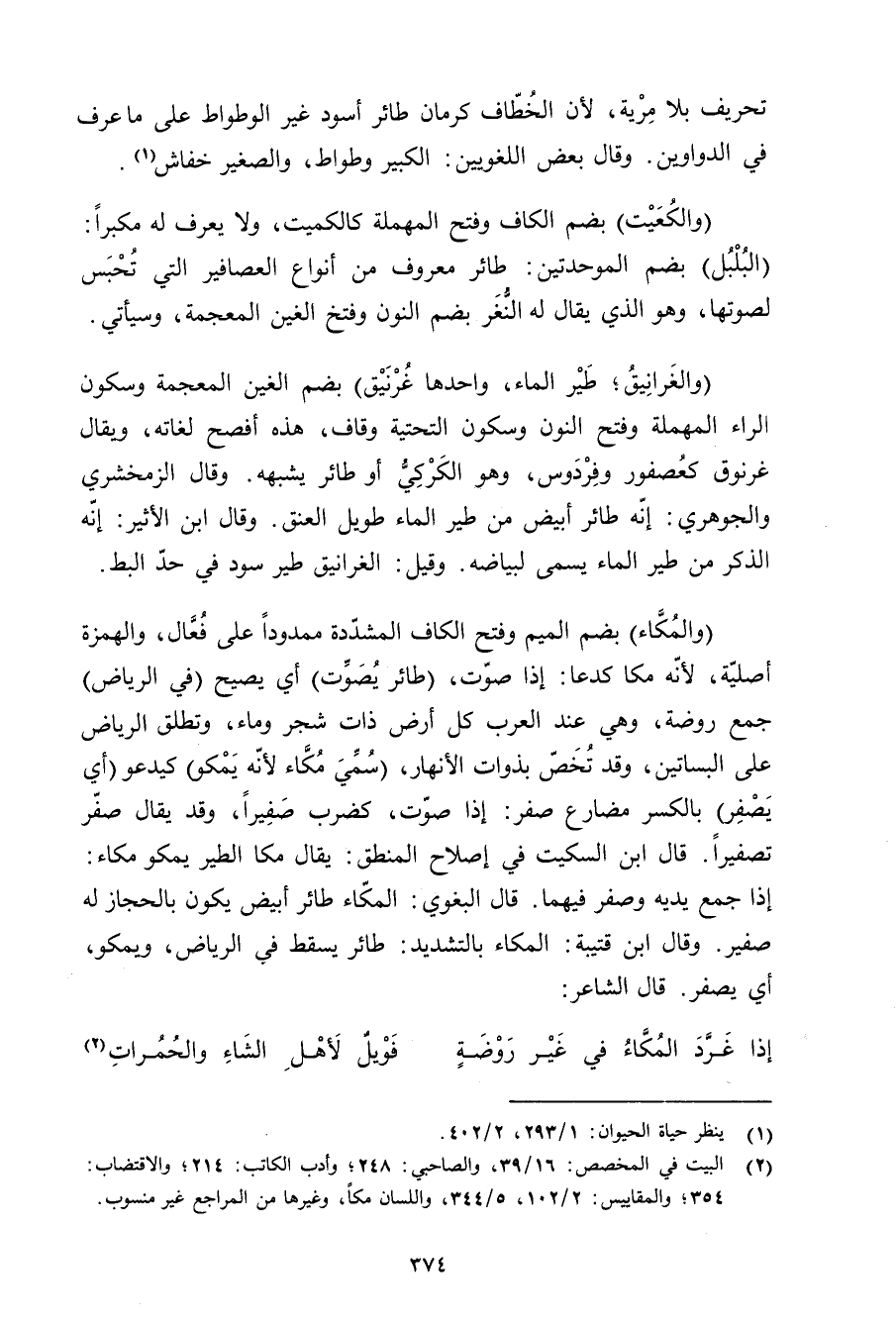 (والمكاء) بضم الميم وتفح الكاف المشددة ممدودًا على فعال, والهمزة أصلية, لأنه مكا كدعا: إذا صوت, (طائر يصوت) أ] يصيح (في الرياض) جمع روضة, وهي عند العرب كل أرض ذات شجر وماء, وتطلق الرياض على البساتين, وقد تخص بذوات الأنهار, (سمي مكاء لأنه يمكو) كيدعو (أي يصفر) بالكسر مضارع صفر: إذا صوت, كضرب صفيرًا, وقد يقال صفر تصفيرًا. قال ابن السكيت في إًصلاح المنطق: يقال مكا الطير يمكو مكاء: إذا جمع يديه وصفر فيهما. قال البغوي: المكاء طائر أبيض يكون بالحجاز له صفير. وقال ابن قتيبة: المكاء بالتشديد: طائر يسقط في الرياض, ويمكو, أي يصفر. قال الشاعر: