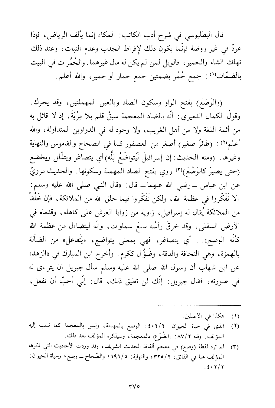 (والوصع) بفتح الواو وسكون الصاد وبالعين المهملتين, وقد يحرك. وقول الكمال الدميري: أنه بالضاد المعجمة سبق قلم بلا مرية, إذ لا قائل به من أئمة اللغة ولا من أهل الغريب, ولا وجود له في الدواوين المتداولة, والله أعلم: (طائر صغير) أصغر من العصفور كما في الصحاح والقاموس والنهاية وغيرها. (ومنه الحديث: إن إسرافيل ليتواضع لله) أي يتصاغر ويتذلل ويخضع (حتى يصير كالوضع) روي بفتح الصاد المهملة وسكونها. والحديث مروي عن ابن عباس - رضي الله عنهما - قال: «قال النبي صلى الله عليه وسلم: «لا تفكروا في عظمة الله, ولكن تفكروا فيما خلق الله من الملائكة, فإن خلقًا من الملائكة يقال له إسرافيل, زاوية من زوايا العرش على كاهله, وقدماه في الأرض السفلى, وقد خرق رأسه سبع سماوات, وأنه ليتضاءل من عظمة الله كأنع الوصع» .. أي يتصاغر, فهي بمعنى يتواضع, «يتفاعل» من الضآلة بالهمزة, وهي النحافة والدقة, وضؤل ككرم. وأخرج ابن المبارك في «الزاهد» عن ابن شهاب أن رسول الله صلى الله عليه وسلم سأل جبريل أن يتراءى له في صورته, فقال جبريل: إنك لن تطيق ذلك, قال: إني أحب أن تفعل,