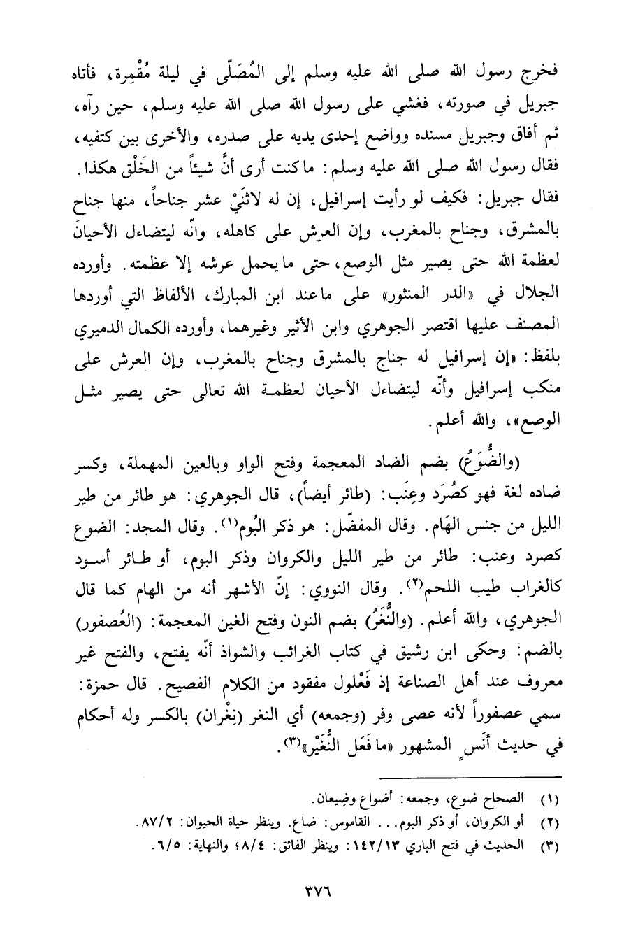 فخرج رسول الله صلى الله عليه وسلمإلى المصلى في ليلة مقمرة, فأتاه جبريل في صورته, فغشي على رسول الله صلى الله عليه وسلم, حين رآه, ثم أفاق وجبريل مسنده وواضع إحدى يديه على صدره, والأخرى بين كتفيه, فقال رسول الله صلى الله عليه وسلم: ما كنت أرى أن شيئًا من الخلق هكذا. فقال جبريل: فكيف لو رأيت إسرافيل, إن له لاثني عشر جناحًا, منها جناح بالمشرق, وجناح بالمغرب, وإن العرش على كاهله, وإنه ليتضاءل الأحيان لعظمة الله حتى يصير مثل الوصع, حتى ما يحمل عرشه إلا عظمته. وأورده الجلال في «الدر المنثور» على ما عند ابن المبارك, الألفاظ التي أوردها المصنف عليها اقتصر الجوهري وابن الأثير وغيرهما, وأورده الكمال الدميري بلفظ: «إن إسرافيل له جناح بالمشرق وجناح بالمغرب, وإن العرش على منكب إسرافيل وأنه ليتضاءل الأحيان لعظمة الله تعالى حتى يصير مثل الوصع» , والله أعلم.