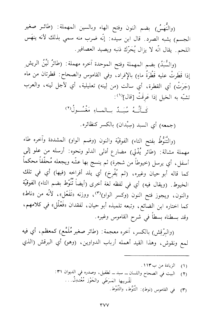(والتنوط بفتح التاء) الفوقية والنون (وضم الواو) المشددة وآخره طاء مهملة مشالة: (طائر يدلي) مضارع أدلى الدلو ونحوه: أرسله من علو إلى أسفل, أي يرسل (خيوطًا من شجرة) ثم ينسج بها عشه ويجعله مخففًا محكمًا كما قاله أبو حيان وغيره, (ثم يفرخ) أي يلد أفراخه (لإيها) أي في تلك الخيوط. (ويقال فيه) أي في لفظه لغة أخرى (أيضًا تتنوط بضم التاء) الفوقية والنون, ويجوز فتح النون (وكسر الواو) , ووزنه «تفعل» , لأنه من «ناط» كما اختاره ابن الضائع, وتبعه تلميذه أبو حيان, لفقدان «فعلل» في كلامهم, وقد بسطناه بسطًا في شرح القاموس وغيره.