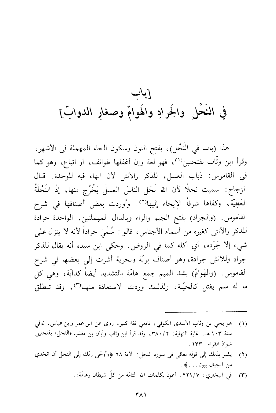 هذا (باب في النحل) , بفتح النون وسكون الحاء المهملة في الأشهر, وقرأ ابن وثاب بفتحتين, فهو لغة وإن أغفلها طوائف, أو اتباع, وهو كما في القاموس: ذباب العسل, للذكر والأنثى لأن الهاء فيه للوحدة. قال الزجاج: سميت نحلًا لأن الله نحل الناس العسل يخرج منها, إذ النخلة العطية, وكفاها شرفًا الإيجاء إليها. وأوردت بعض أصنافها في شرح القاموس. (والجراد) بفتح الجيم والراء وبالدال المهملتين, الواحدة جرادة للذكر والأنثى كغيره من أسماء الأجناس, قالوا: سمي جرادًا لأنه لا ينزل على شيء إلا جرده, أي أكله كما في الروض. وحكى ابن سيده أنه يقال للذكر جراد وللأنثى جرادة, وهو أصناف برية وبحرية أشرت إلى بعضها في شرح القاموس. (والهوام) بشد الميم جمع هامة بالتشديد أيضًا كدابة, وهي ك ل ما له يقتل كالحية, ولذلك وردت الاستعاذة منها, وقد تطلق