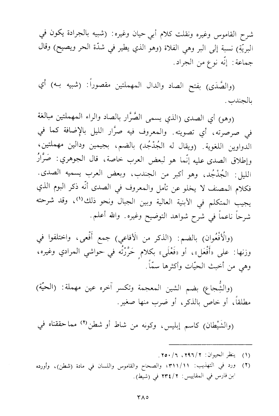 (وهو) أي الصدى (الذي يسمى الصرار بالصاد والراء المهملتين مبالغة في صرصرته, أي تصويته. والمعروف فيه صرار الليل بالإضافة كما في الدواوين اللغوية. (ويقال له الجدجد) بالضم, بجيمين ودالين مهملتين, وإطلاق الصدى عليه إنما هو لبعض االعرب خاصة, قال الجوهري: صرار الليل: الجدجد, وهو أكبر من الجندب, وبعض العرب يسميه الصدى. فكلام المصنف لا يخلو عن تأمل والمعروف في الصدى أنه ذكر البوم الذي يجيب المتكلم في الأبنية العالية وبين الجبال ونحو ذلك, وقد شرحته شرحًا ناعمًا في شرح شواهد التوضيح وغيره. والله أعلم.