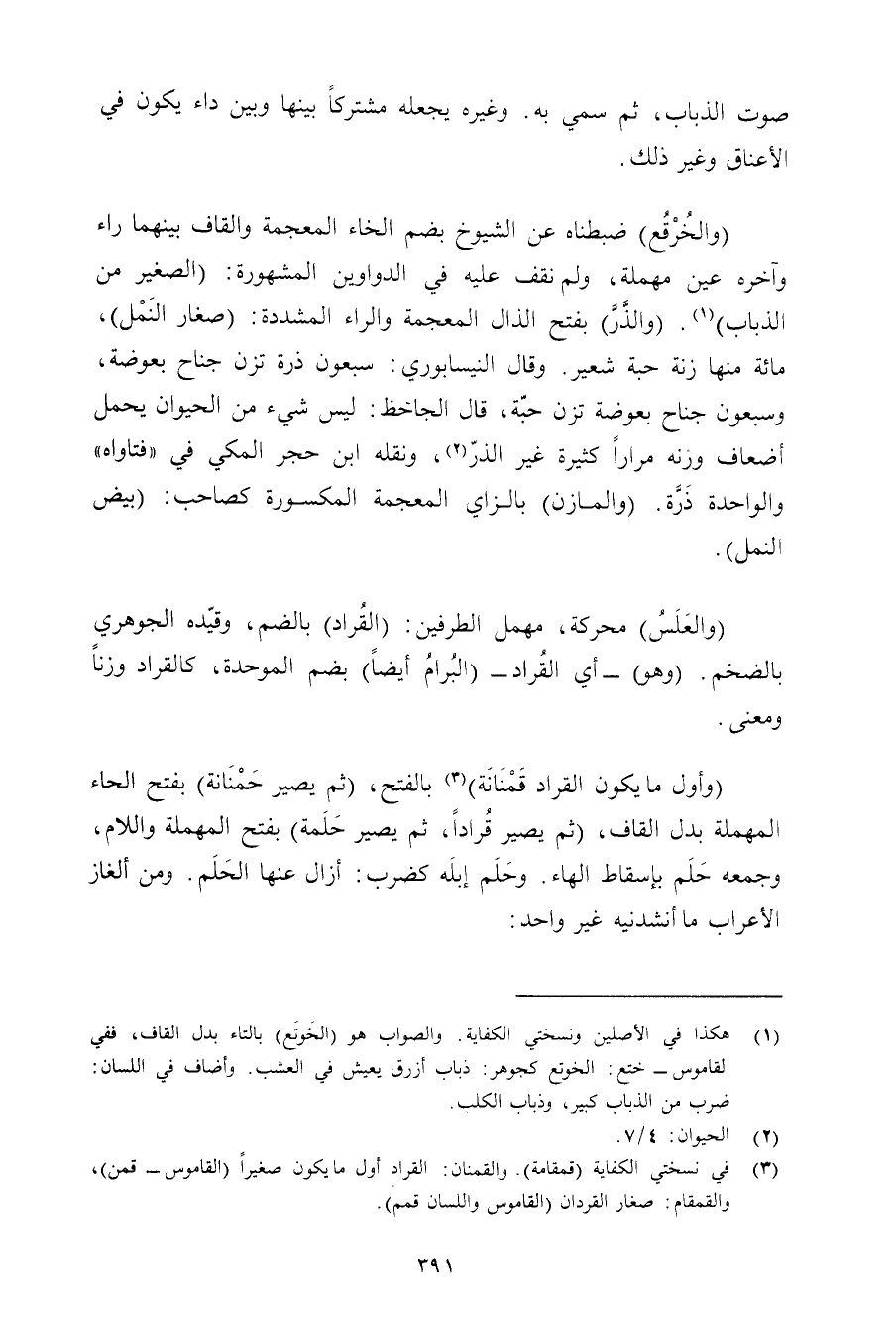 (والخرقع) ضبطناه عن الشيوخ بضم الخاء المعجمة والقاف بينهما راء وآخره عين مهملة, ولم نقف عليه في الدواوين المشهورة: (الصغير من الذباب). (والذر) بفتح الذال المعجمة والراء المشددة: (صغار النمل) , مائة منها زنة حبة شعير. وقال النيسابوري: سبعون ذرة تزن جناح بعوضة, وسبعون جناح بعوضة تزن حبة, قال الجاحظ: ليس شيء من الحيوان يحمل أضعاف وزنه مرارًا كثيرة غير الذر, ونقله ابن حجر المكي في «فتاواه» والواحدة ذرة. (والمازن) بالزاي المعجمة المكسورة كصاحب: (بيض النمل).