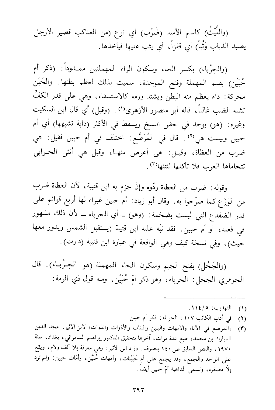 (والحرباء) بكسر الحاء وسكون الراء المهملتين ممدودًا: (ذكر أم حبين) بضم المهملة وفتح الموحدة, سميت بذلك لعظم بطنها. والحبن محركة: داء يعظم منه البطن ويشتد ورمه كالاستسقاء, وهي على قدر الكف تشبه الضب غالبًا, قاله أبو منصور الأزهري. (وقيل) أي قال ابن السكيت وغيره: (هو) يوجد في بعض النسخ ويسقط في الأكثر (دابة تشبهها) أي أم حبين وليست هي. قال في المرصع: اختلف في أم حبين فقيل: هي ضرب من العظاة, وقيل: هي أعرض منها, وقيل هي أنثى الحرابى تتحاماها العرب فلا تأكلها لنتنها.