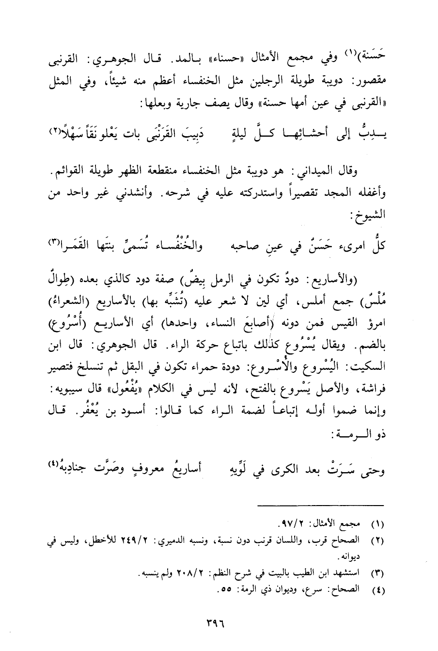(والأساريع: دود تكون في الرمل بيض) صفة دود كالذي بعده (طوال ملس) جمع أملس, أي لين لا شعر عليه (تشبه بها) بالأساريع (الشعراء) امرؤ القيس فمن دونه (أصابع النساء, واحدها) أي الأساريع (أسروع) بالضم. ويقال يسروع كذلك باتباع حركة الراء. قال الجوهري: قال ابن السكيت: اليسروع والأسروع: دودة حمراء تكون في البقل ثم تنسلخ فتصير فراشة, والأصل يسروع بالفتح, لأنه ليس في الكلام «يفعول» قال سيبويه: وإنما ضموا أوله إتباعًا لضمة الراء كما قالوا: أسود بن يعفر. قال ذو الرمة: