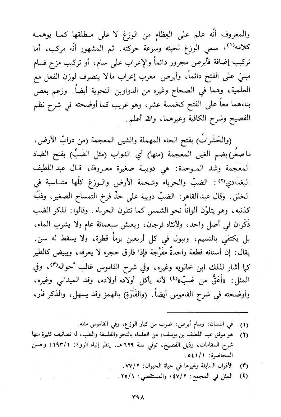 (والحشرات) بفتح الحاء المهملة والشين المعجمة (من دواب الأرض, ما صغر) بضم الغين المعجمة (منها) أي الدواب (مثل الضب) بفتح الضاد المعجمة وشد الموحدة: هي دويبة صغيرة معروفة, قال عبد اللطيف البغدادي: الضب والحرباء وشحمة الأرض والوزغ كلها متناسبة في الخلق. وقال عبد القاهر: الضب دويبة على حد فرخ التمساح الصغير, وذنبه كذنبه, وهو يتلون ألوانًا نحو الشمس كما تتلون الحرباء. وقالوا: لذكر الضب ذكران في أصل واحد, ولأنثاه فرجان, ويعيش سبعمائة عام ولا يضرب الماء, بل يكتفي بالنسيم, ويبول في كل أربعين يومًا قطرة, ولا يسقط له سن. يقال: إن أسنانه قطعة واحدة مفرجة فإذا فارق حجره لا يعرفه, ويبيض كالطير كما أشار لذلك ابن خالويه وغيره, وفي شرح القاموس غالب أحواله, وفي المثل: «أعق من ضب» لأنه يأكل أولاده أولاده, وقد الميداني وغيره, وأوضحه في شرح القاموس أيضًا. (والفأرة) بالهمز وقد يسهل, والذكر فأر,