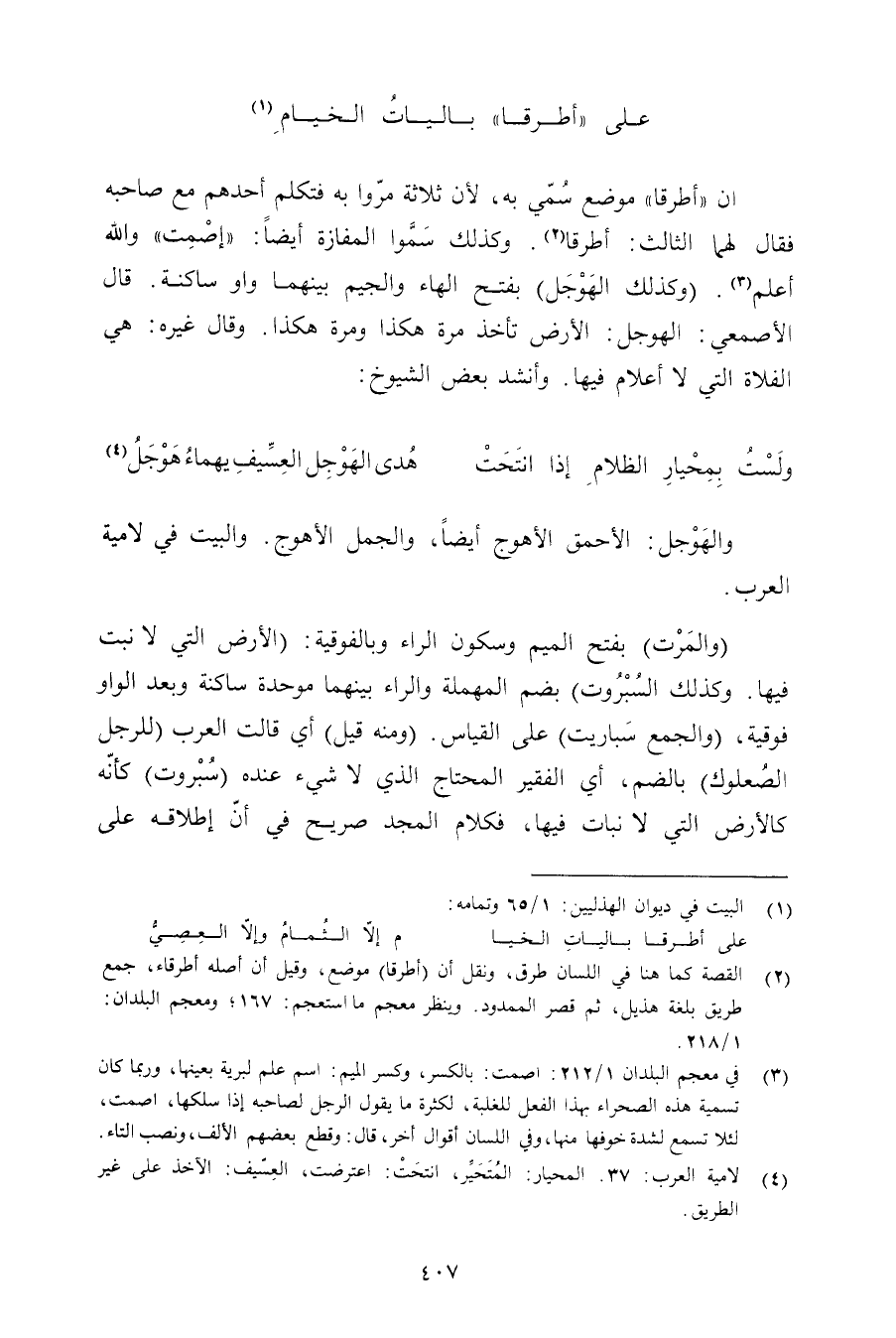 أن «أطرقا» موضع سمي به, لأن ثلاثة مروا به فتكلم أحدهم مع صاحبه فقال لهما الثالث: أطرقا. وكذلك سموا المفازة أيضًا: «إصمت» والله أعلم. (وكذلك الهوجل) بفتح الهاء والجيم بينهما واو ساكنة. قال الأصمعي: الهوجل: الأرض تأخذ مرة هكذا ومرة هكذا. وقال غيره: هي الفلاة التي لا أعلام فيها. وأنشد بعض الشيوخ:
