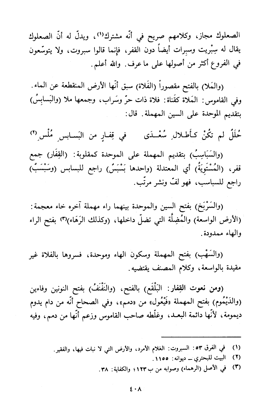 (والسباسب) بتقديم المهملة على الموحدة كمقلوبة: (القفار) جمع قفر, (المستوية) أي المعتدلة (واحدها بسبس) راجع للبسابس (وسبسب) راجع للسباسب, فهو لف ونشر مرتب.