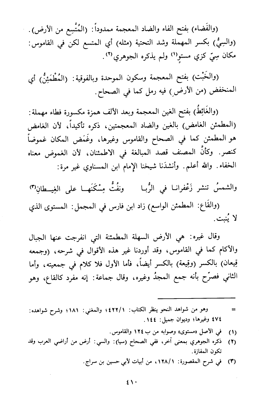 وقال غيره: هي الأرض السهلة المطمئنة التي انفرجت عنها الجبال والآكام كما في القاموس, وقد أوردنا غير هذه الأقوال في شرحه, (وجمعه قيعان) بالكسر (وقيعة) بالكسر أيضًا, فأما الأول فلا كلام في جمعيته, وأما الثاني فصرح بأنه جمع المجد وغيره, وقال جماعة: إنه مفرد كالقاع, وهو