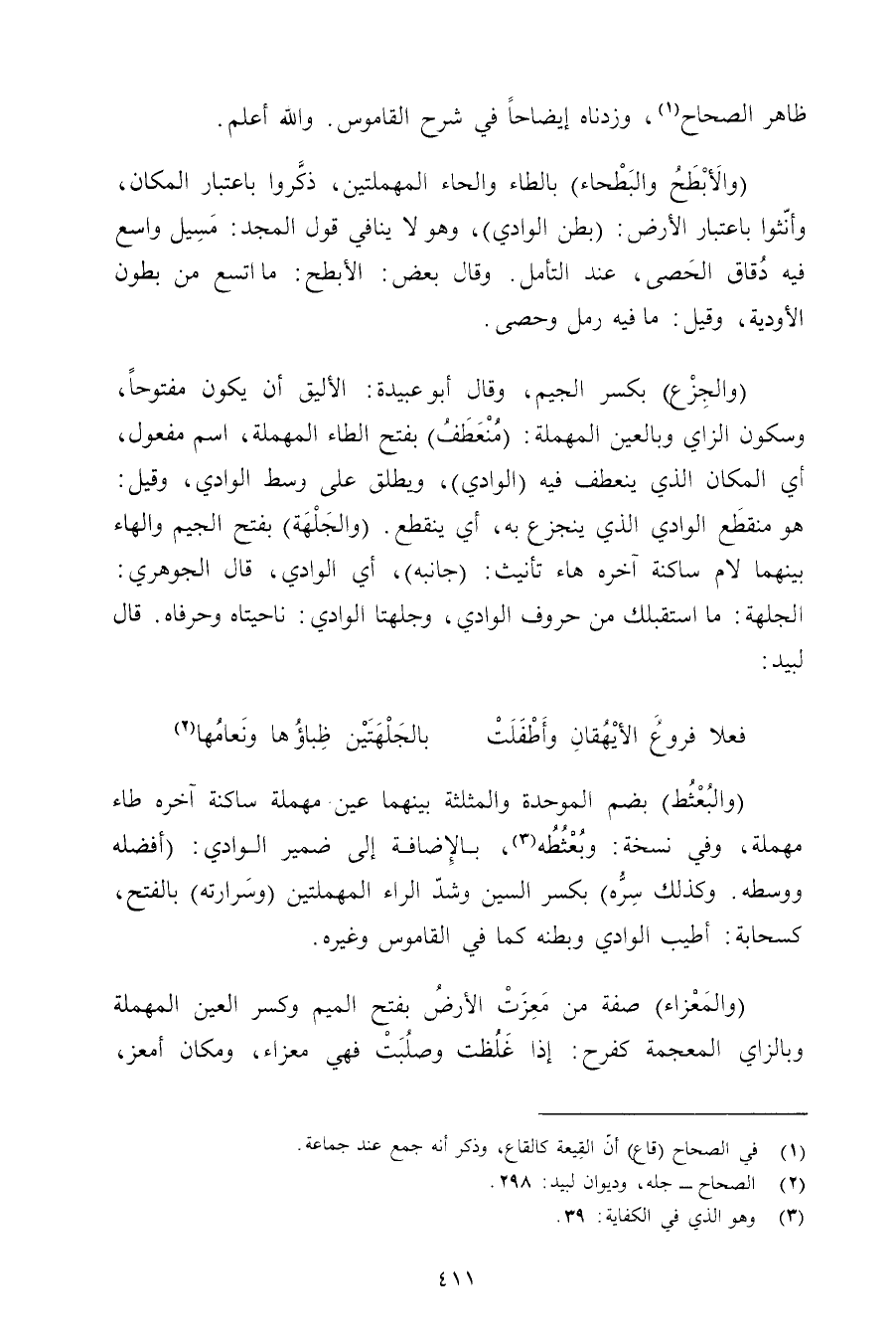 (والجزع) بكسر الجيم, وقال أبو عبيدة: الأليق أن يكون مفتوحًا, وسكون الزاي وبالعين المهملة: (منعطف) بفتح الطاء المهملة, اسم مفعول, أي المكان الذي ينعطف فيه (الوادي) , ويطلق على وسط الوادي, وقيل: هو منقطع الوادي الذي ينجزع به, أي ينقطع. (والجهلة) بفتح الجيم والهاء بينهما لام ساكنة آخره هاء تأنيث: (جانبه) , أي الوادي, قال الجوهري: الجلهة: ما استقبلك من حروف الوادي, وجلهتا الوادي: ناحيتاه وحرفاه. قال لبيد: