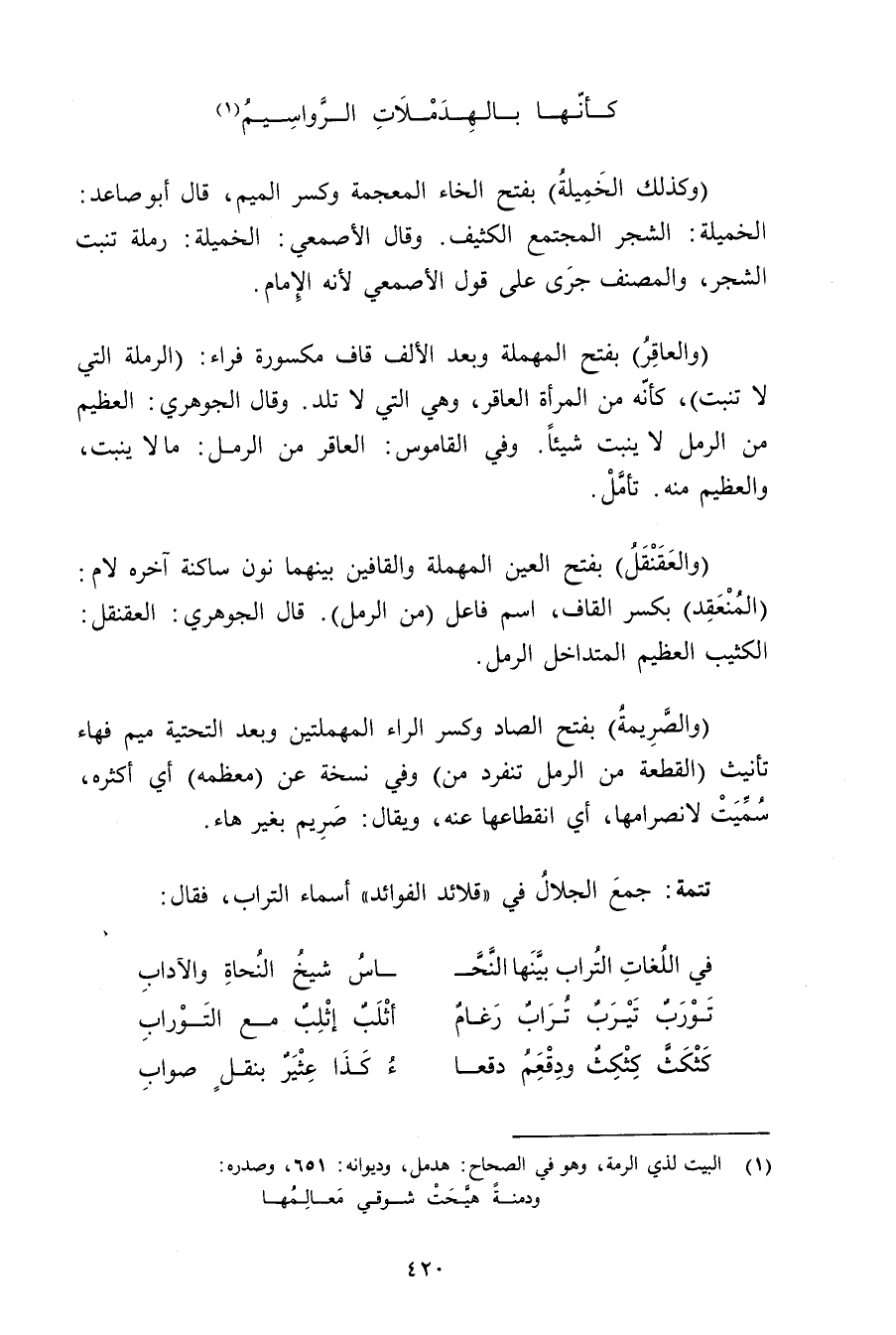 (والعاقر) بفتح المهملة وبعد الألف قاف مكسورة فراء: (الرملة التي لا تنتب) , كأنه من المرأة العاقر, وهي التي لا تلد. وقال الجوهري: العظيم من الرمل لا ينبت شيئًا. وفي القاموس: العاقر من الرمل: ما لا ينبتو والعظيم منه. تأمل.