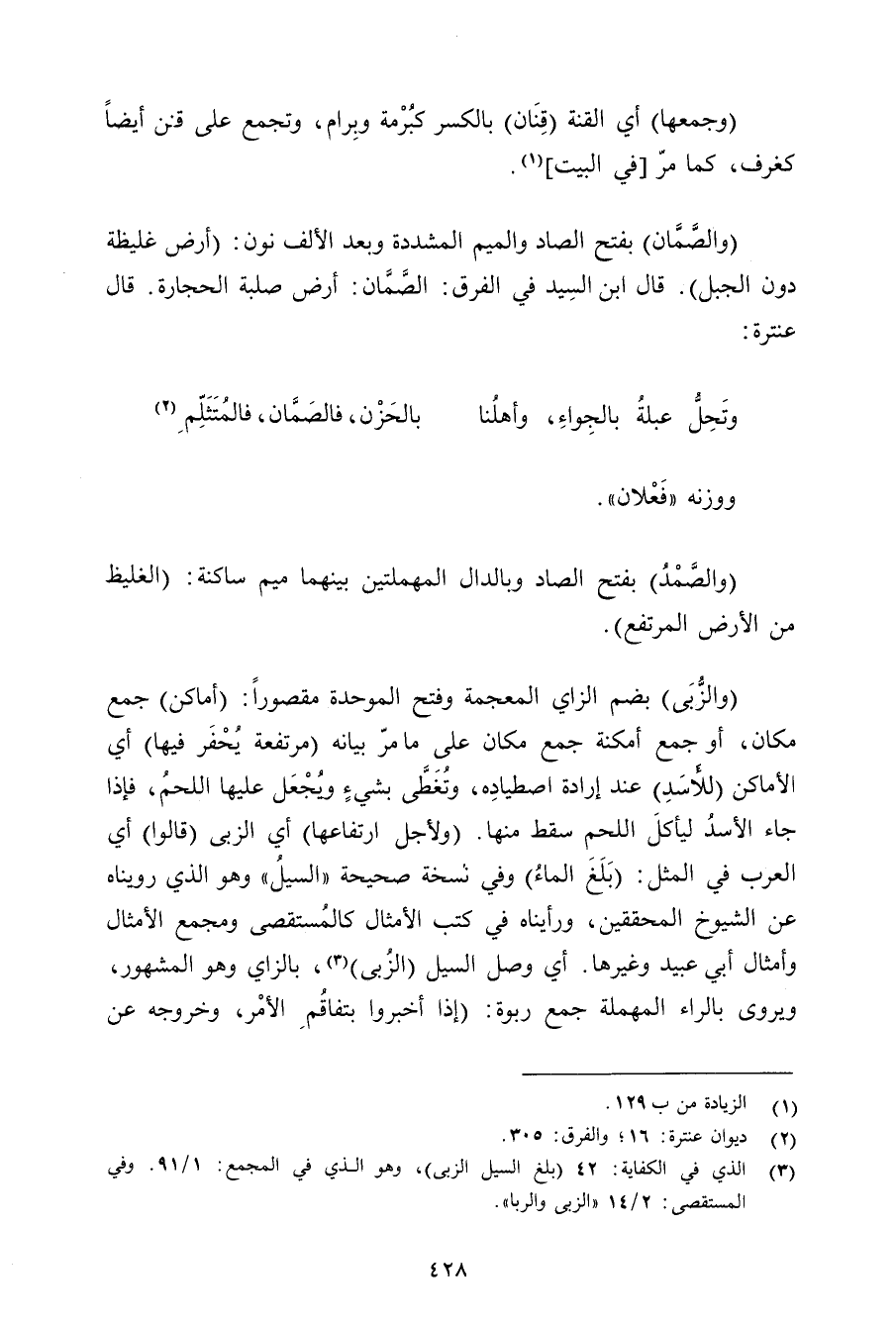 (والزبى) بضم الزاي المعجمة وفتح الموحدة مقصورًا: (أماكن) جمع مكان, أو جمع أمكنة جمع مكان على ما مر بيانه (مرتفعة يحفر بيها) أي الأماكن (للأسد) عند إرادة اصطياده, وتغطى بشيءٍ ويجعل عليها اللحم, فإذا جاء الأسد ليأكل اللحم سقط منها. (ولأجل ارتفاعها) أي الزبى (قالوا) أي العرب في المثل: (بلغ الماء) وفي نسخة صحيحة «السيل» وهو الذي رويناه عن الشيوخ المحققين, ورأيناه في كتب الأمثال كالمستقصى ومجمع الأمثال وأمثال أبي عبيد وغيرها. أي وصل السيل (الزبى) , بالزاي وهو المشهور, ويورى بالراء المهملة جمع ربوة: (إذا أخبروا بتفاقم الأمر, وخروجه عن