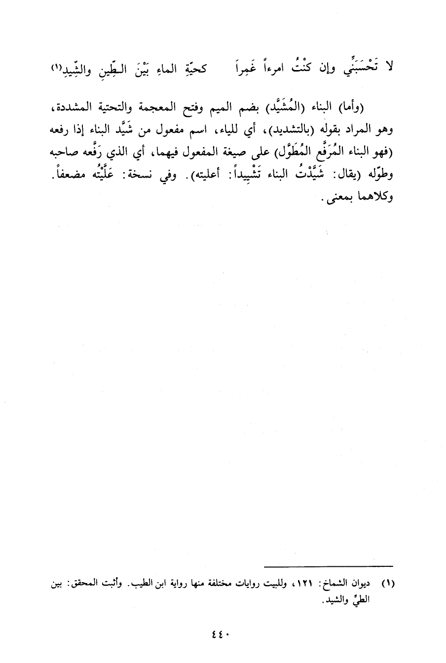 (وأما) البناء (المشيد) بضم الميم وفتح المعجمة والتحتية المشددة, وهو المراد بقوله (بالتشديد) , أي للياء, اسم مفعول من شيد البناء إذا رفعه (فهو البناء المرفع المطول) على صيغة المفعول فيهما, أي الذي رفعه صاحبه وطوله (يقال: شيدت البناء تشييدًا: أعليته). وفي نسخة: عليته مضعفًا. وكلاهما بمعنى.