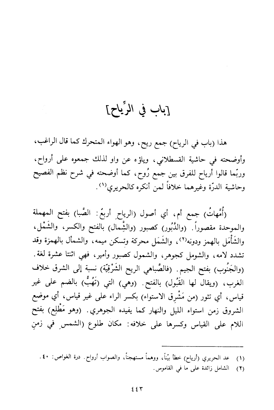 هذا (باب في الرياح) جع ريح, وهو الهواء المتحرك كما قال الراغب, وأوضحته في حاشية القسلطاني, وياؤه عن واو لذلك جمعوه على أرواح, وربما قالوا أرياح للفرق بين جمع روح, كما أوضحته في شرح نظم الفصيح وحاشية الدرة وغيرهما خلافًا لمن أنكره كالحريري.