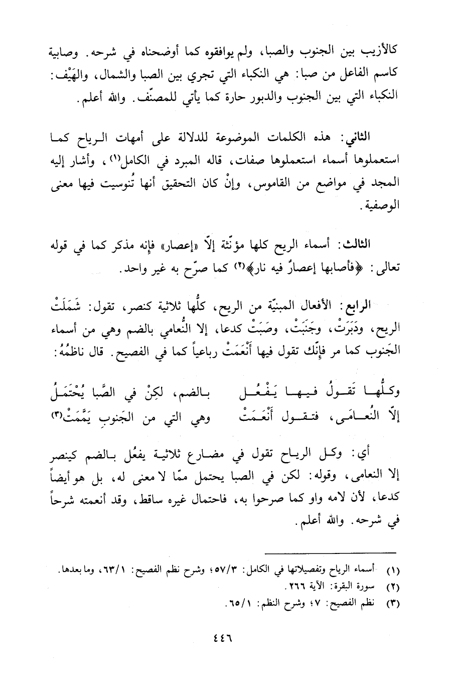 الرابع: الأفعال المبنية من الريح, كلها ثلاثيةكنصر, تقول: شملت الريح, ودبرت, وجنبت, وصبت كدعا, إلا النعامي بالضم وهي من أسماء الجنوب كما مر فإنك تقول فيها أنعمت رباعيًا كما في الفصيح. قال ناظمة: