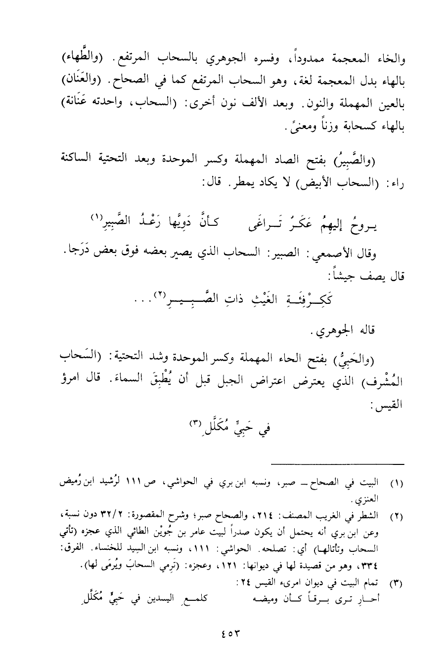 (والصبير) بفتح الصاد المهملة وكسر الموحدة وبعد التحتية الساكنة راء: (السحاب الأبيض) لا يكاد يمطر. قال: